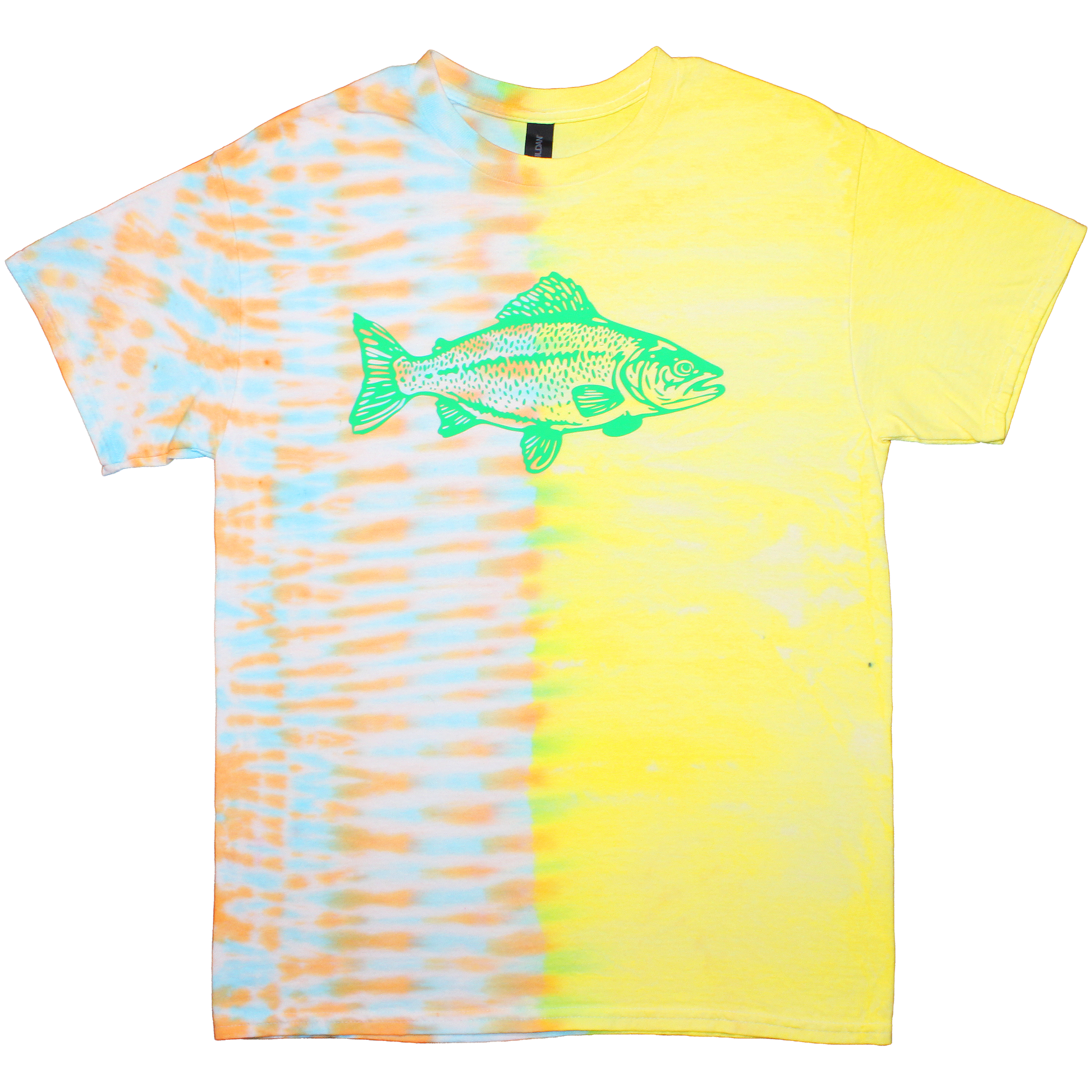 Green vinyl graphic on yellow, orange, and light blue dyed 100% cotton tee.