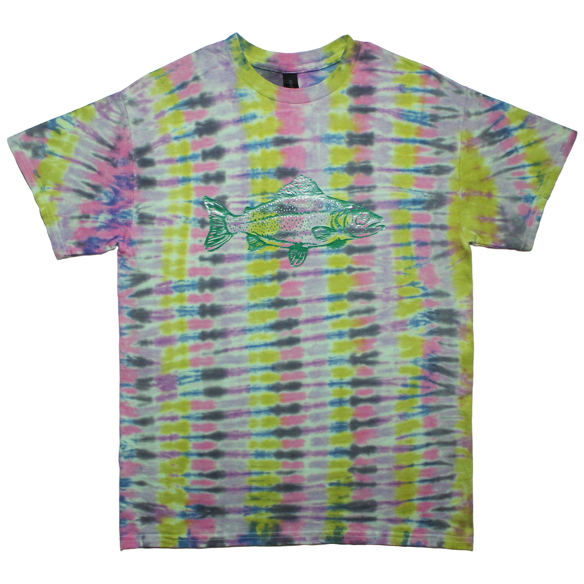 Green vinyl graphic on green, pink, purple, and blue dyed 100% cotton tee.