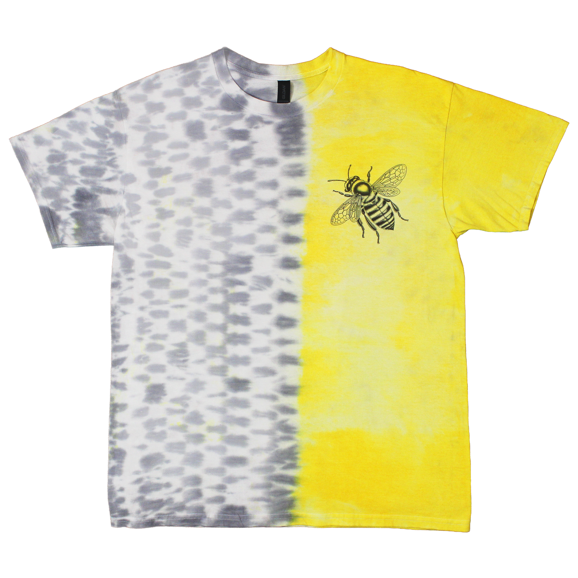 Black graphic on yellow and gray dyed 100% cotton tee.