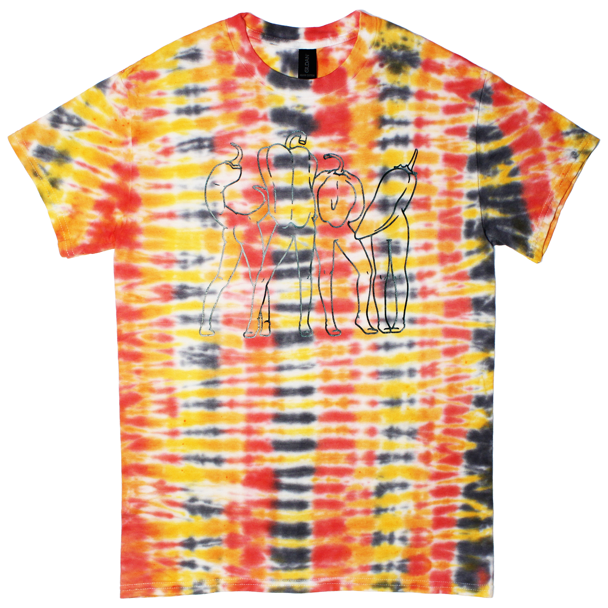 Dark green vinyl graphic on red, orange, yellow, and black dyed 100% cotton tee.