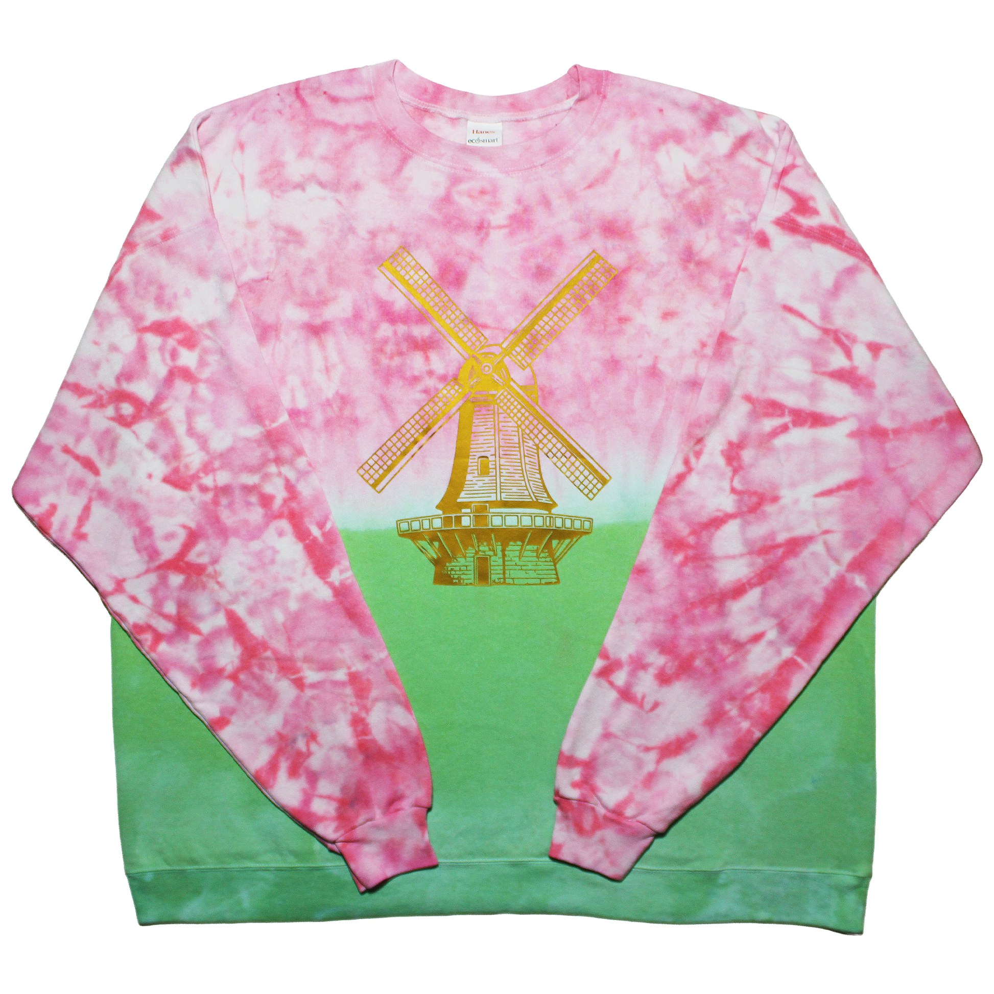 Bronze vinyl graphic on pink and green dyed 50% cotton 50% polyester crewneck sweatshirt.